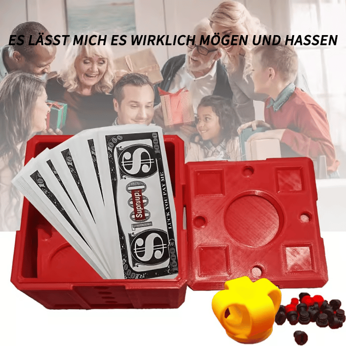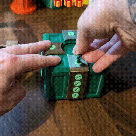 Die Geschenkbox ist eine 3D-gedruckte Geschenkbox, bei der der Öffner den versteckten Schlüssel unter der oberen Schleife finden und dann alle Schrauben abschrauben muss, um an das Geschenk zu gelangen.