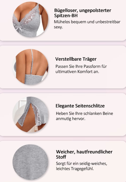 Dieses luxuriöse Nachtwäsche, hergestellt aus hochwertigen, hautfreundlichen Stoffen, betont sanft Ihre Kurven. Dezente Spitzenakzente verleihen Eleganz und unterstreichen Ihren natürlichen Charme. Ideal sowohl für Komfort als auch für besondere Anlässe, bietet es eine perfekte, maßgeschneiderte Passform.