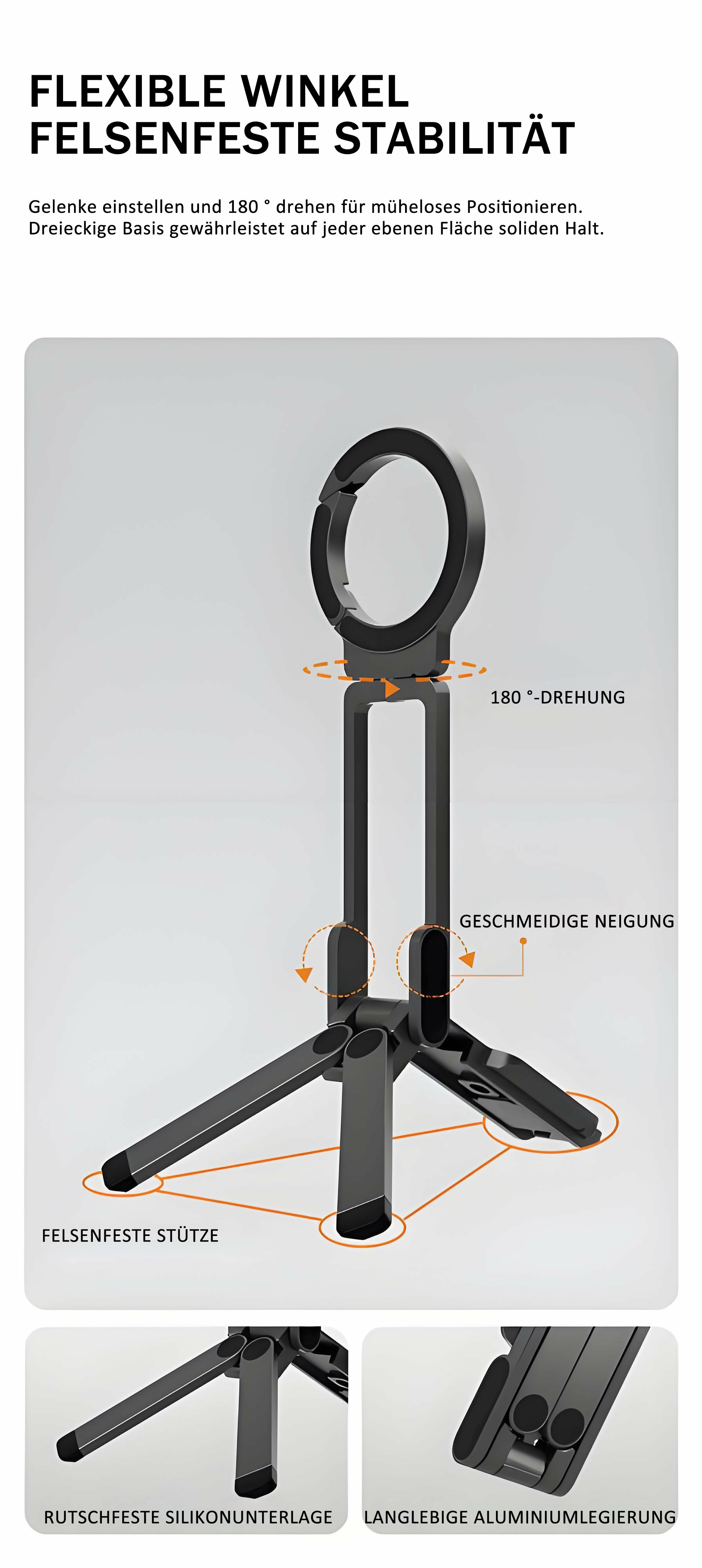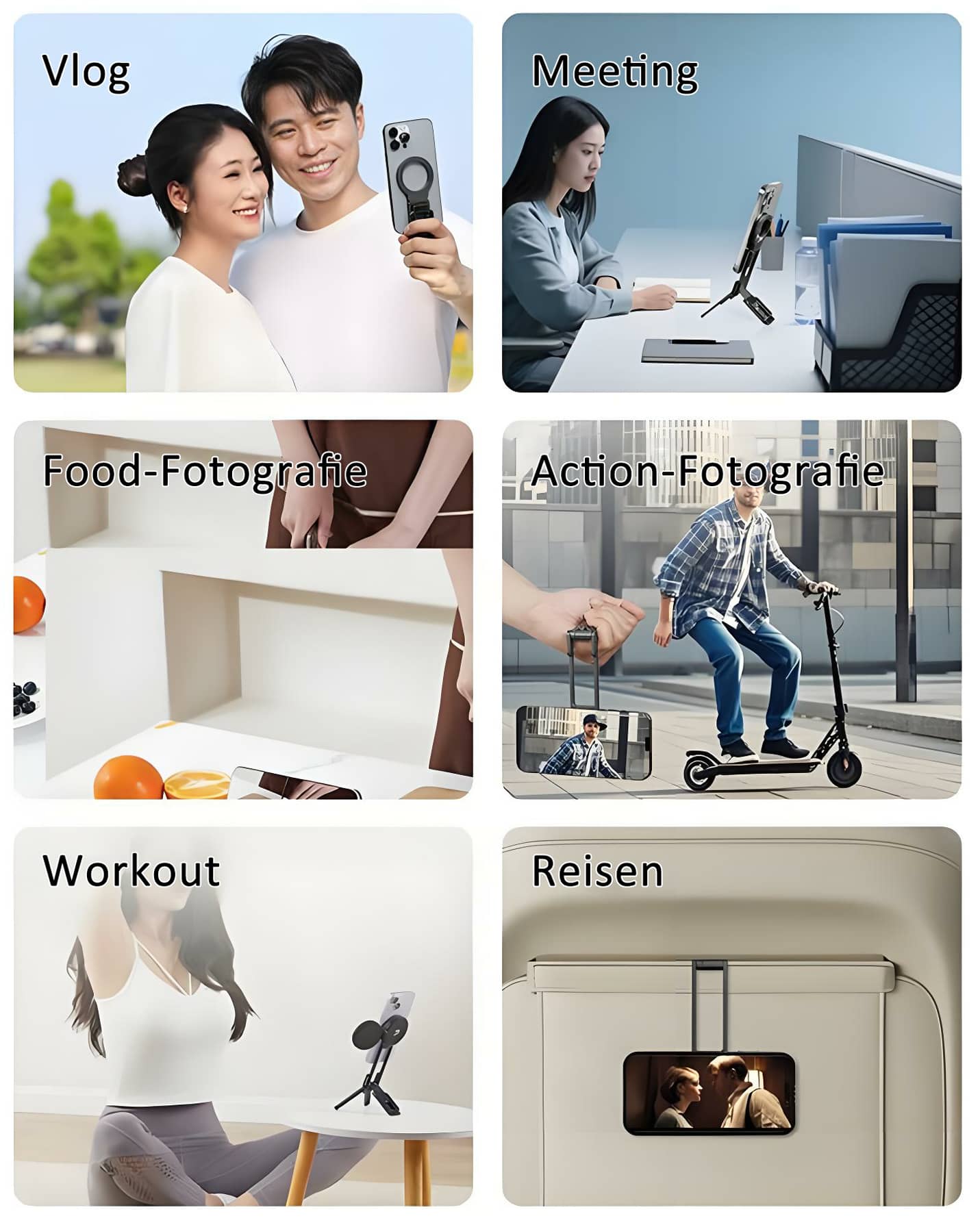 Keine Lust mehr auf das Jonglieren mit Geräten, ungünstige Winkel und verwackelte Aufnahmen? Das magnetische Handystativ MA38 ist Ihr All-in-One-Tool für flüssiges Vlogging, Fitnessaufnahmen und stabile Telefongespräche. Erschließen Sie sich überall kreative Freiheit.