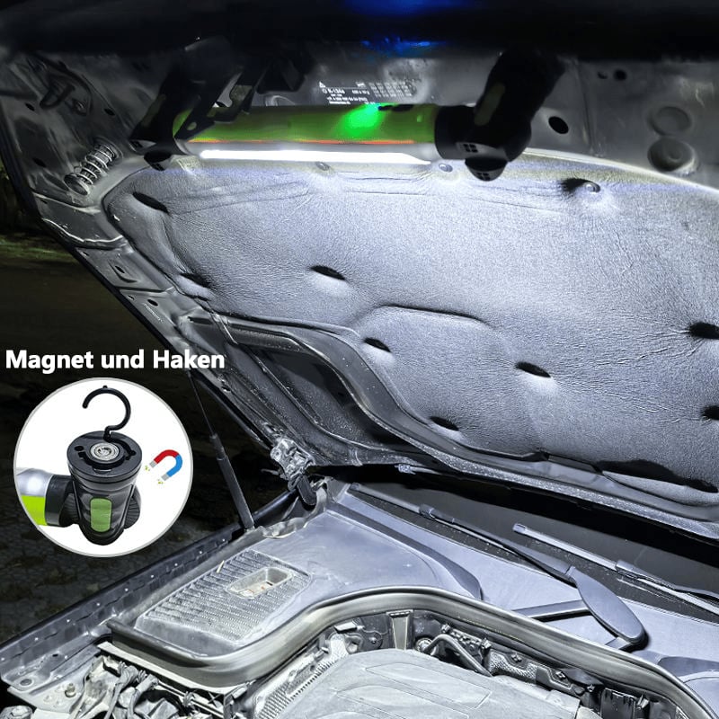 Zwei starke Magnetfüße und versteckte, um 360° drehbare Haken ermöglichen die flexible Montage oder Aufhängung – ob unter der Motorhaube, an der Wand oder über Ihrer Werkstatt. Ideal für Mechaniker, Garagen, Werkstätten, Camping, Notfälle oder Stromausfälle.